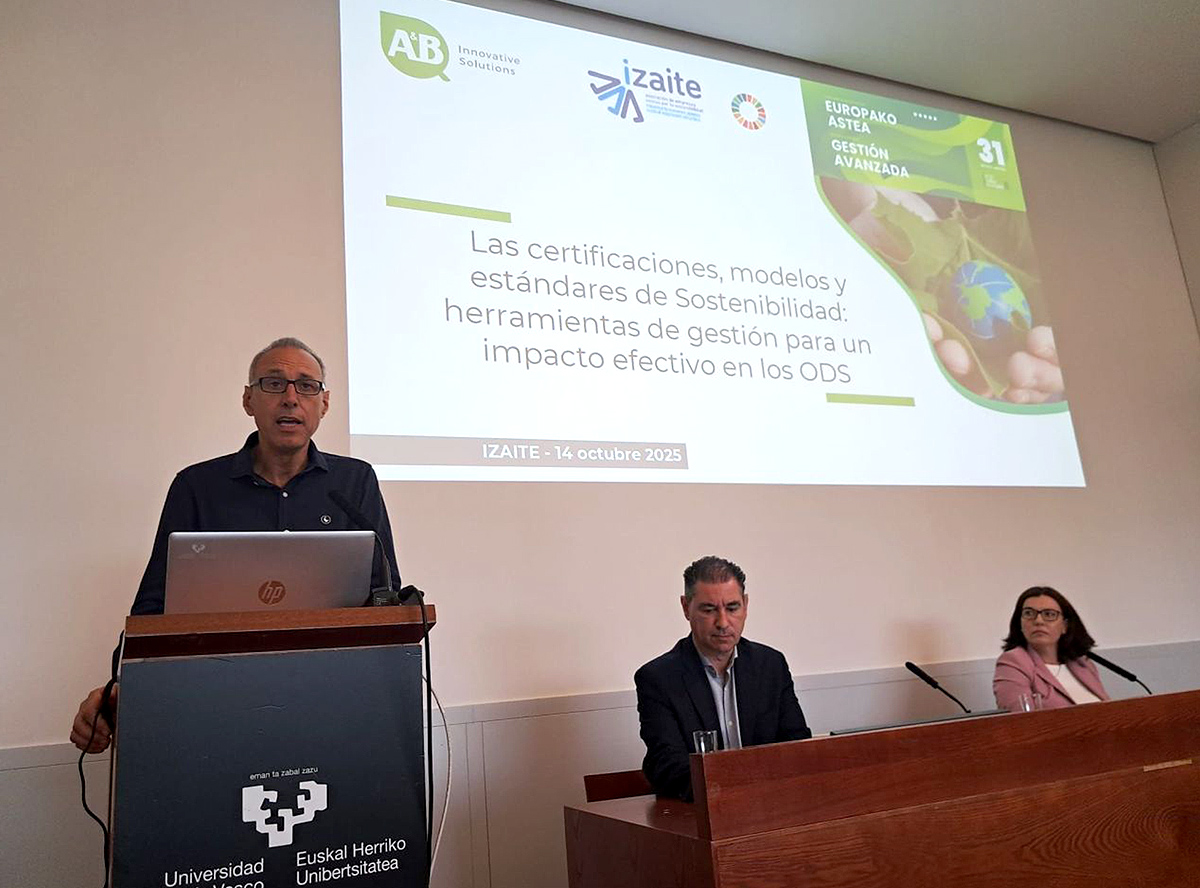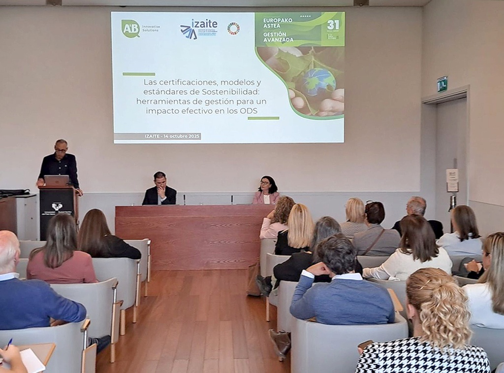 En el marco de la Semana Europea de Gestión Avanzada 2025, Izaite organizó el pasado 14 de octubre la jornada titulada 'Las certificaciones, modelos y estándares de Sostenibilidad: herramientas de gestión para un impacto efectivo en los ODS'. El encuentro contó con el conocimiento y las experiencias de AENOR, A&B Laboratorios de Biotecnología y Grupo Campezo.